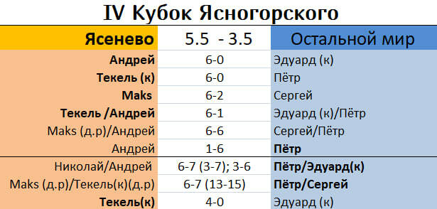 Сборная Ясенево в четвёртый раз подряд выигрывает турнир, несмотря на два болезненных поражения в парах. Сборная остального мира впервые наббрала больше 2 очков. Тем не менее, одиночные игры однозначно решили исход противостояния в пользу сборной Ясенева