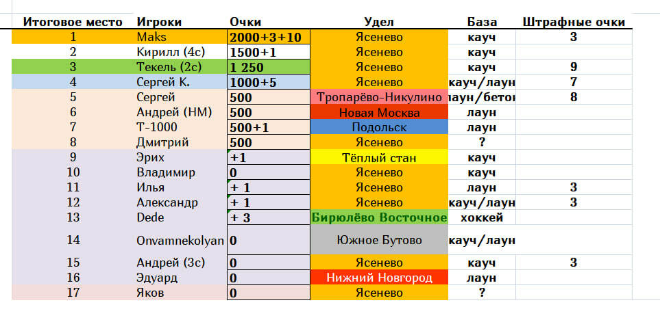 | 2 | Кирилл | Ясенево | один раз (22) | один раз (25) | один раз (23) | - | 4 |
